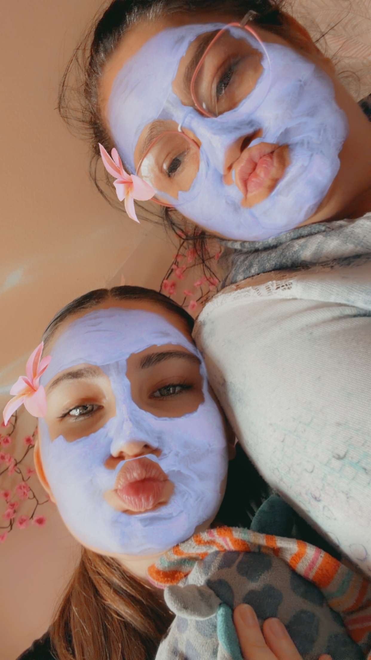 They lean cheek to cheek in the soft theater light, matching warm layers and calm smiles, looking snug and sweet as they wait for the show to start together.